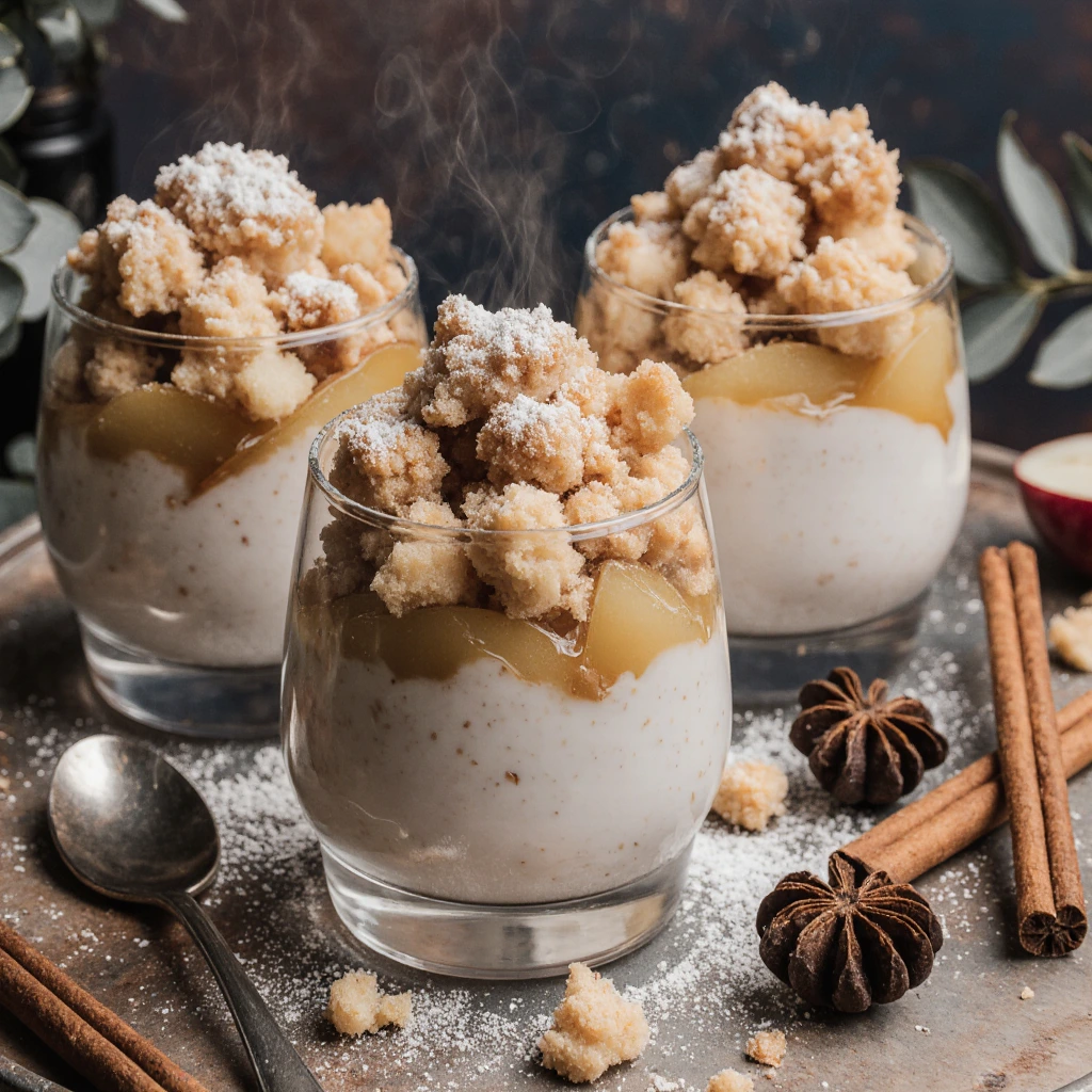- Das Apfelkompott in Schalen servieren und das Crumble-Topping großzügig darüber streuen.