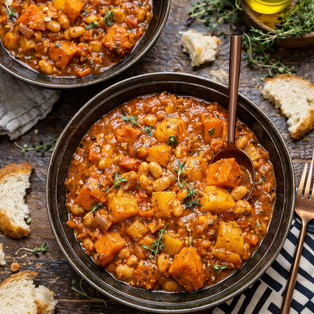 - Weiße Bohnen sowie gewürfelte Süßkartoffeln und russet Kartoffeln einrühren. Den frischen Thymian hinzufügen.