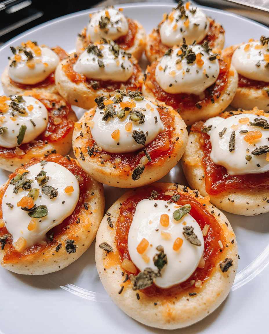 - Backe die Mini-Pizzen im Ofen 8-10 Minuten, bis sie goldbraun und knusprig sind. Lass sie kurz abkühlen, bevor du sie servierst.