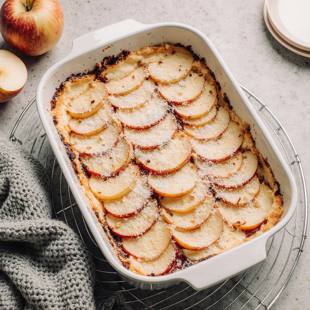 - Hälfte der Apfelstücke unter die Quarkmischung heben und in eine gefettete Backform gießen.